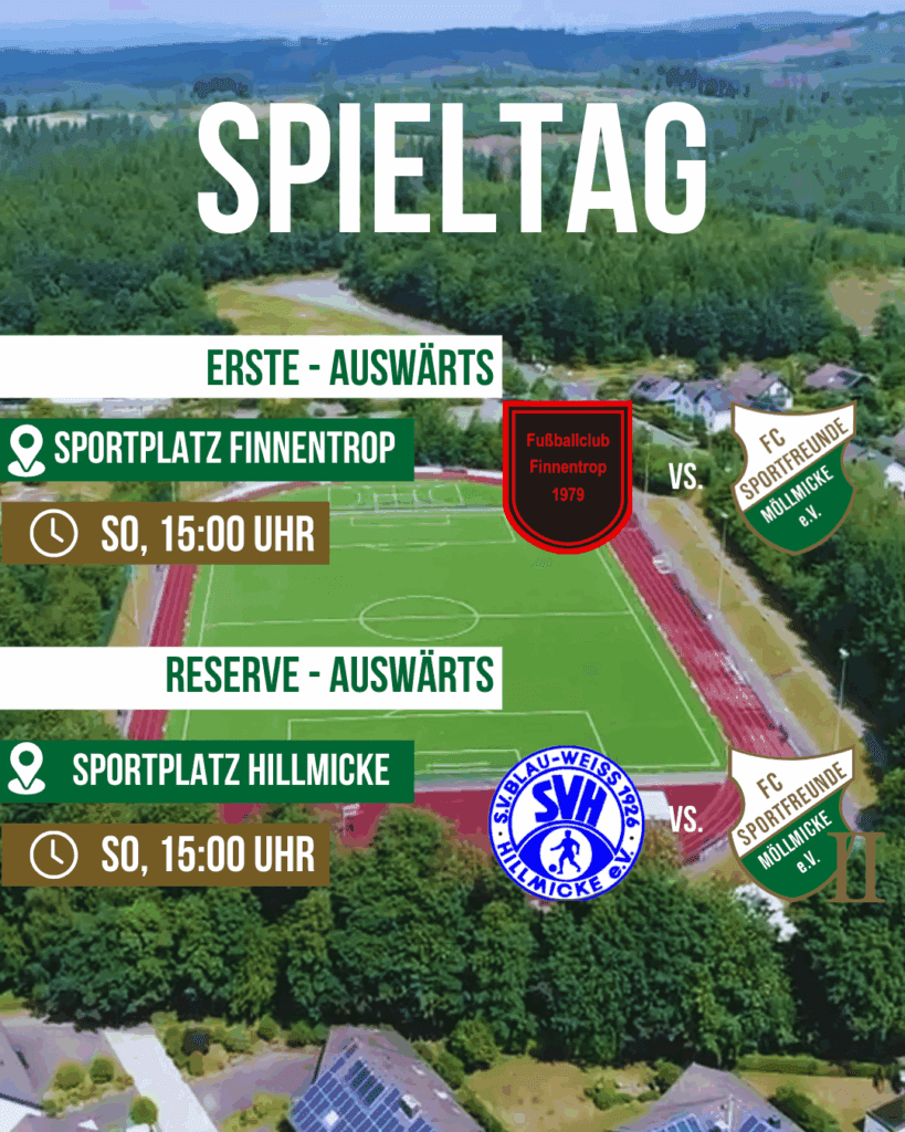 Die erste Mannschaft spielt am kommenden Sonntag auswärts gegen den FC Finnentrop. Die Zweite spielt am Sonntag auswärts gegen den SV Hillmicke.